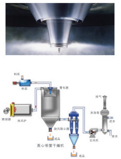 空氣經(jīng)過過濾和加熱,進(jìn)入干燥器頂部空氣分配器,熱空氣呈螺旋狀均勻地進(jìn)入干燥室。料液經(jīng)塔體頂部的高速離心霧化器,(旋轉(zhuǎn))噴霧成極細(xì)微的霧狀液珠,與熱空氣并流接觸,在極短的時(shí)間內(nèi)可干燥為成品。成品連續(xù)地由干燥塔底部和旋風(fēng)分離器中輸出,廢氣由風(fēng)機(jī)排空。